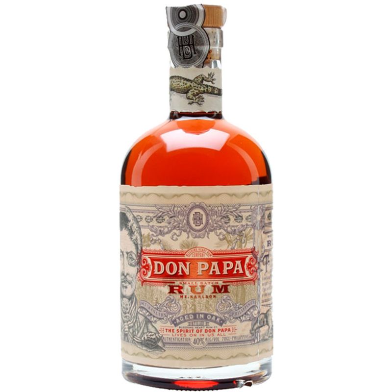 Ron premium elaborado en pequeñas partidas en la Isla de Negros Occidental en Filipinas conocida por la gran calidad de la caña de azúcar, una de las mejores de todo el mundo, gracias a la perfecta combinación de clima, geografía y la rica tierra volcánica de la isla. Don Papa envejece durante 7 años en barricas de roble al pie del monte Kantlaon. Ligero y afrutado en nariz, en boca es suave y delicado con ricos aromas de vainilla, especias, miel y fruta caramelizada. El 10 años es una edición limitada, un ron más oscuro, profundo y rico con notas de roble, cacao y frutos secos y sutiles notas de vainilla.