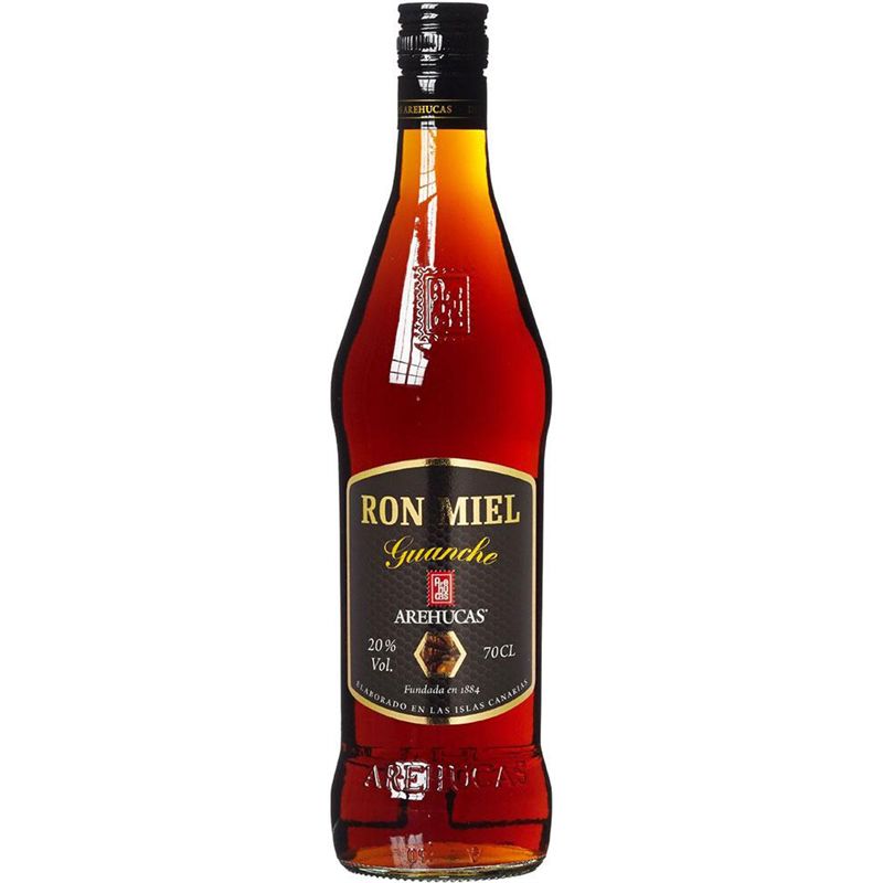 Ron Miel Guanche Arehucas está compuesto por ron añejado y miel, con la que se ha conseguido una bebida de buen cuerpo y exquisito sabor ideal para tomarlo solo, en cualquier época del año. La miel empleada es 100% natural.