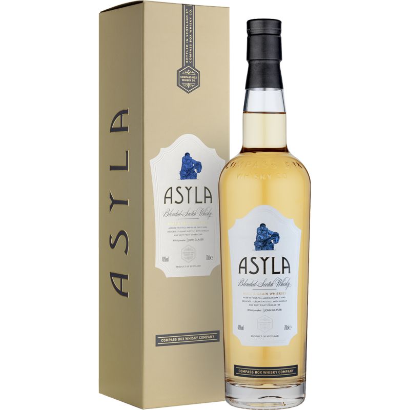 Whisky de remarcable finura elaborado por John Glaser, el creador de la sociedad Compass Box. Resulta del ensamblaje de 2 single malt de Speyside, Linkwood y Cragganmore y de un whisky de grano que proviene de la destilería Cambus cerrada en 1993. El secreto para hacer Asyla es la calidad de las barricas. Utilizamos sólo whiskys envejecidos en barricas de roble americano usadas una vez, porque estos whiskies rinden con más carácter de vainilla, más riqueza y más dulzura que en barricas reutilizables.