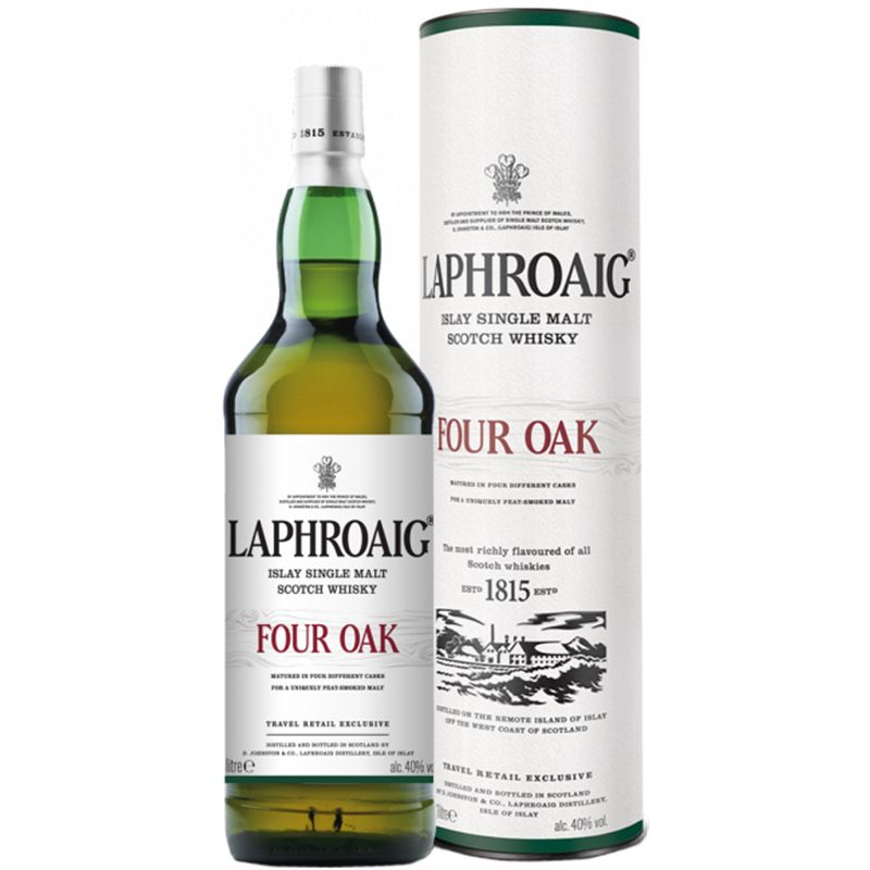 Suave y complejo, Laphroaig Four Oak combina un solo Single Malt el envejecimiento con una variedad de cuatro barriles de roble. Se seleccionan a mano cuatro toneles diferentes; ex-barriles de bourbon, quarter cask, barricas de roble americano virgen y hogshead de roble europeo más grande. Esta compleja combinación crea una malta Islay ahumada con turba cremosa y dorada con notas cálidas de vainilla tostada.