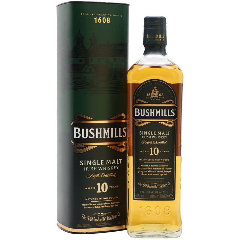 Bushmills malt 10 años, esta cuidadosamente destilado tres veces para darle una excepcional suavidad y pureza, como se hace con los whiskeys irlandeses, utilizando agua pura del arroyo st. Columbs que fluye sobre una vieja roca de basalto hacia la vieja destilería de Bushmills.